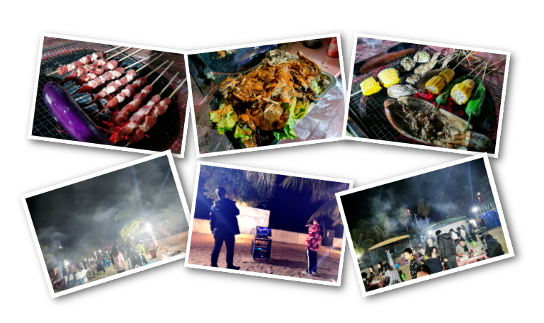 天黑之后便是我們晚上的重頭戲——沙灘BBQ。大家圍坐在燒烤臺(tái)邊,許多同事的隱藏技能被開發(fā)出來,熟練的收拾著食材,有模有樣的烤串,吃著燒烤喝著啤酒,吹著海風(fēng)唱著歌,推杯換盞,吃飽喝足,盡情歌唱,不亦樂乎。