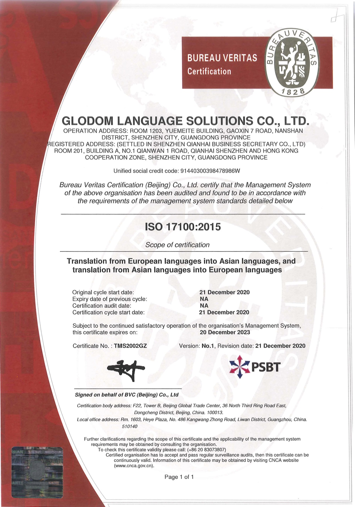 At the end of 2020, Glodom Language Solutions (Glodom) successfully completed the ISO17100:2015 translation services certification. The award of this certificate provides a convincing proof of Glodom's compliance with the world's highest translation standard in terms of translators, technology and service quality, thus ensuring excellent translation services and solutions for customers.